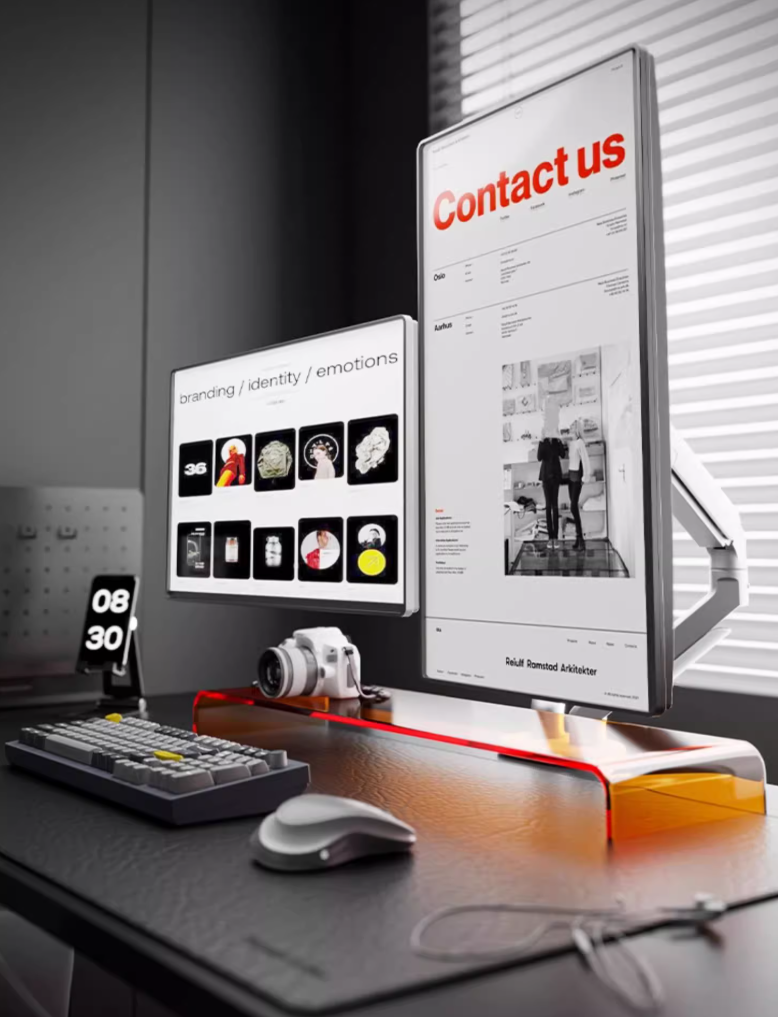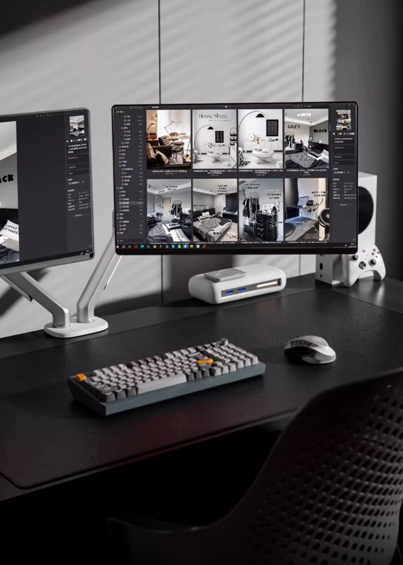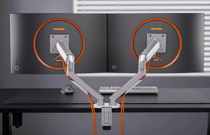 Boost your productivity with the sleek and space-saving T6-2G dual monitor arm, designed to hold two 17"-32" monitors (up to 19.8 lbs each). Featuring independent gas spring arms for effortless height, tilt, swivel, and rotation adjustments, this modern mount creates an ergonomic workstation with perfect screen alignment. Includes C-clamp and grommet mounting options with integrated cable management for a clean setup.