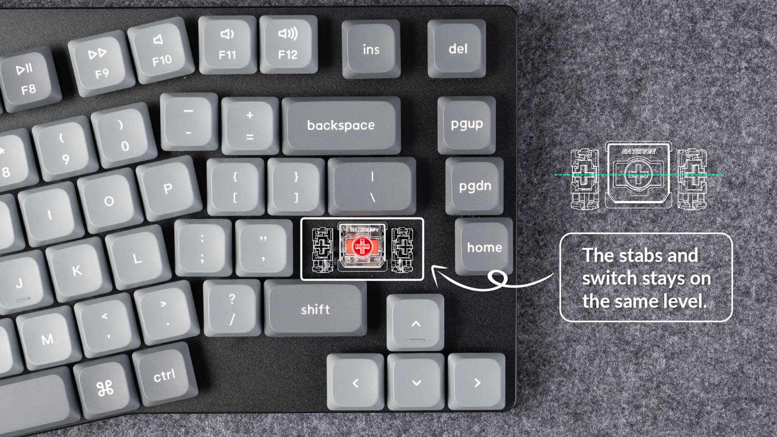 Inside, redesigned stabilizers ensure that larger keys remain level, reducing wobble and delivering a consistent feel on every press.
