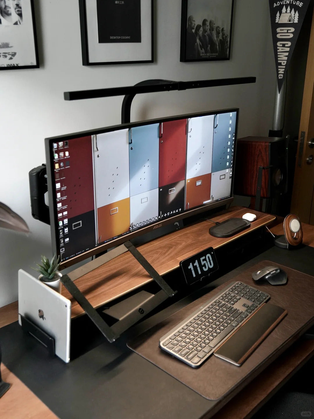 Crafted from premium black walnut and beech wood, this minimalist monitor stand elevates your screen to ergonomic height while adding natural warmth to your workspace. The dual-platform design offers both monitor elevation and convenient storage space underneath.