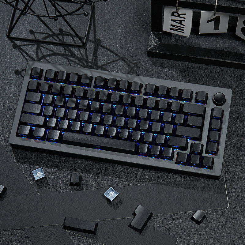 Complete 131-key PBT keycaps (white/black) with side-engraved legends. Cherry profile ensures OEM-height consistency across all keys.